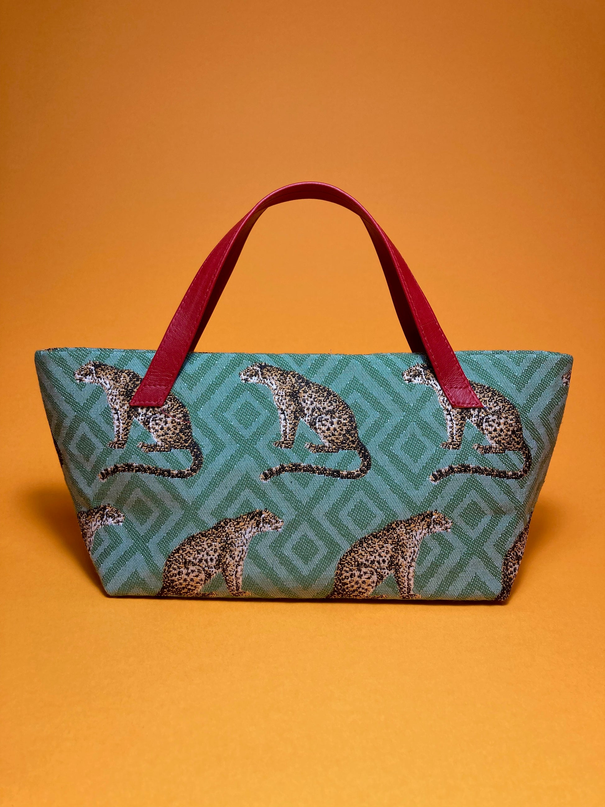 kleine Handtasche aus hochwertigem Dekostoff - sitzende Leoparden auf grünem Untergrund -mit rotem Baumwollfutter und roten Echtledergriffen