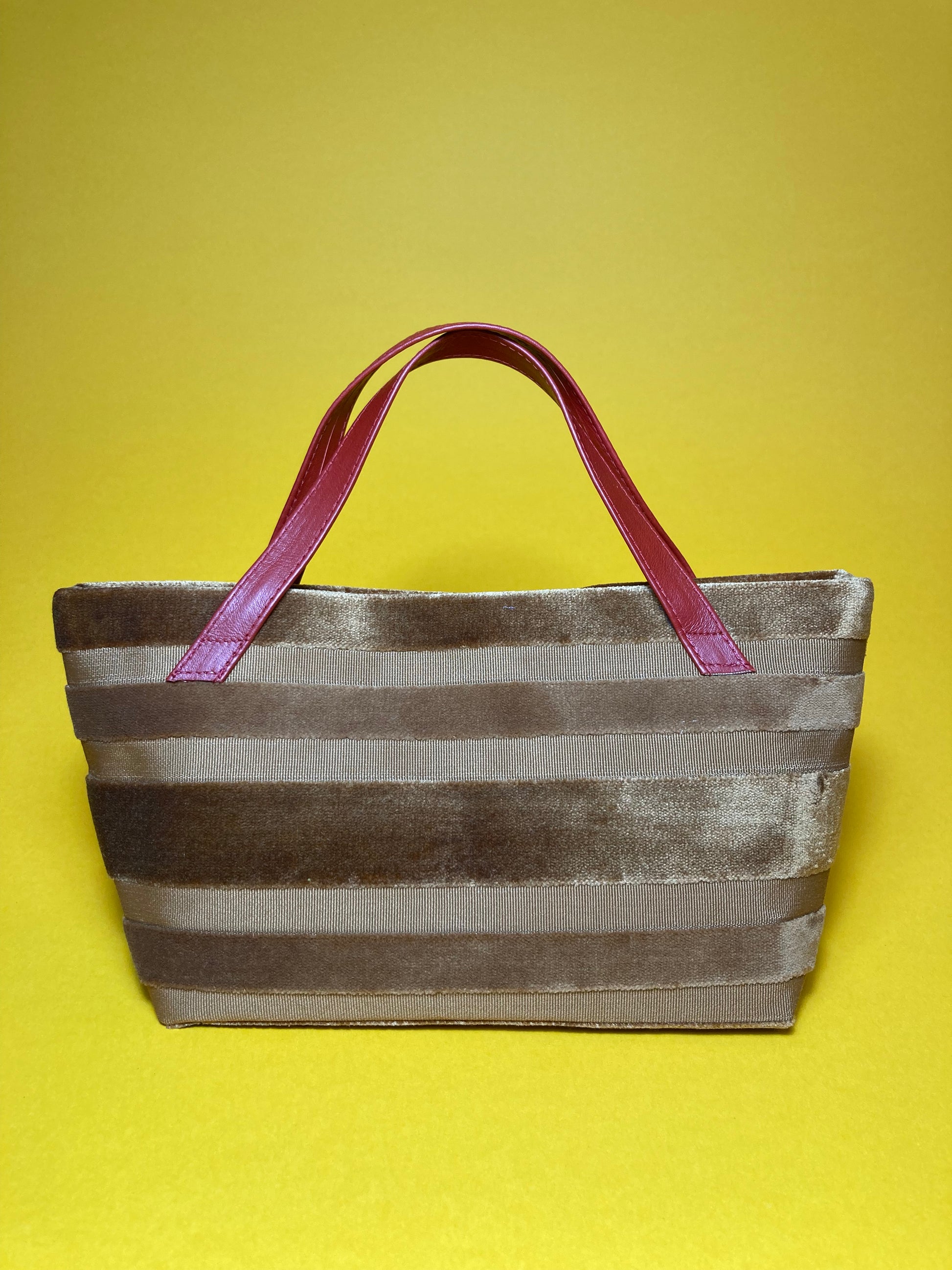 kleine Handtasche aus hochwertigem Samt-Dekostoff - breit braune Streifen uni -mit rotem Baumwollfutter und roten Echtledergriffen