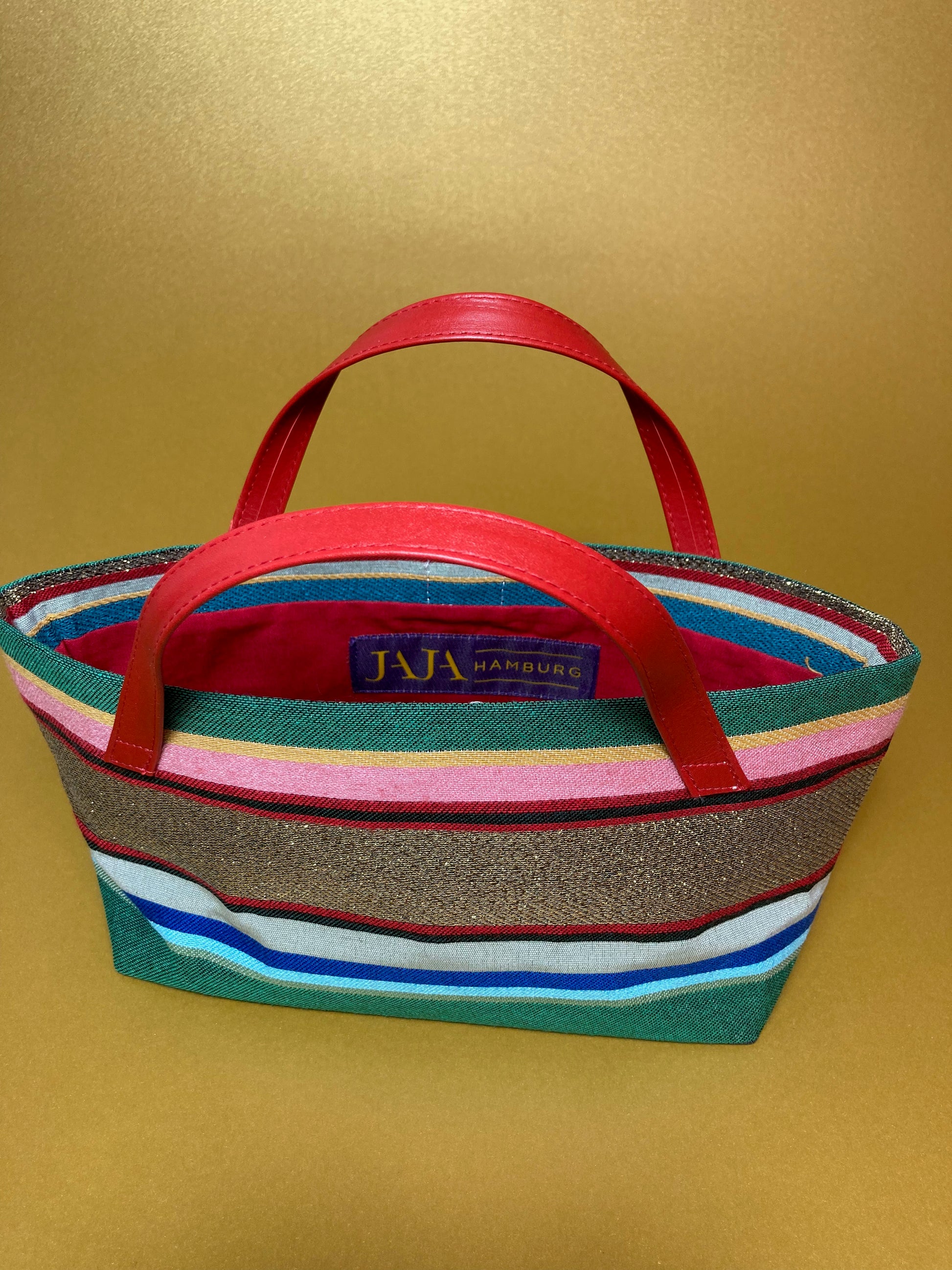 kleine Handtasche aus hochwertigem Dekostoff - bunte Streifen mit Gold - mit rotem Baumwollfutter und roten Echtledergriffen