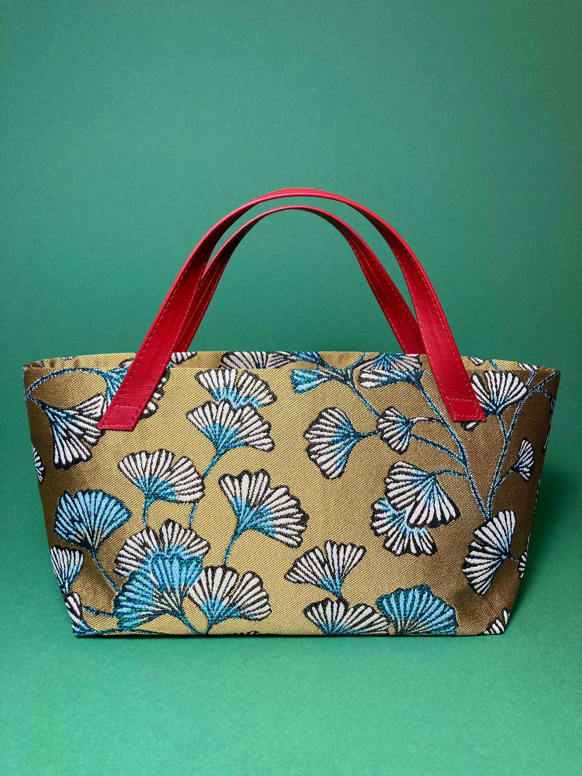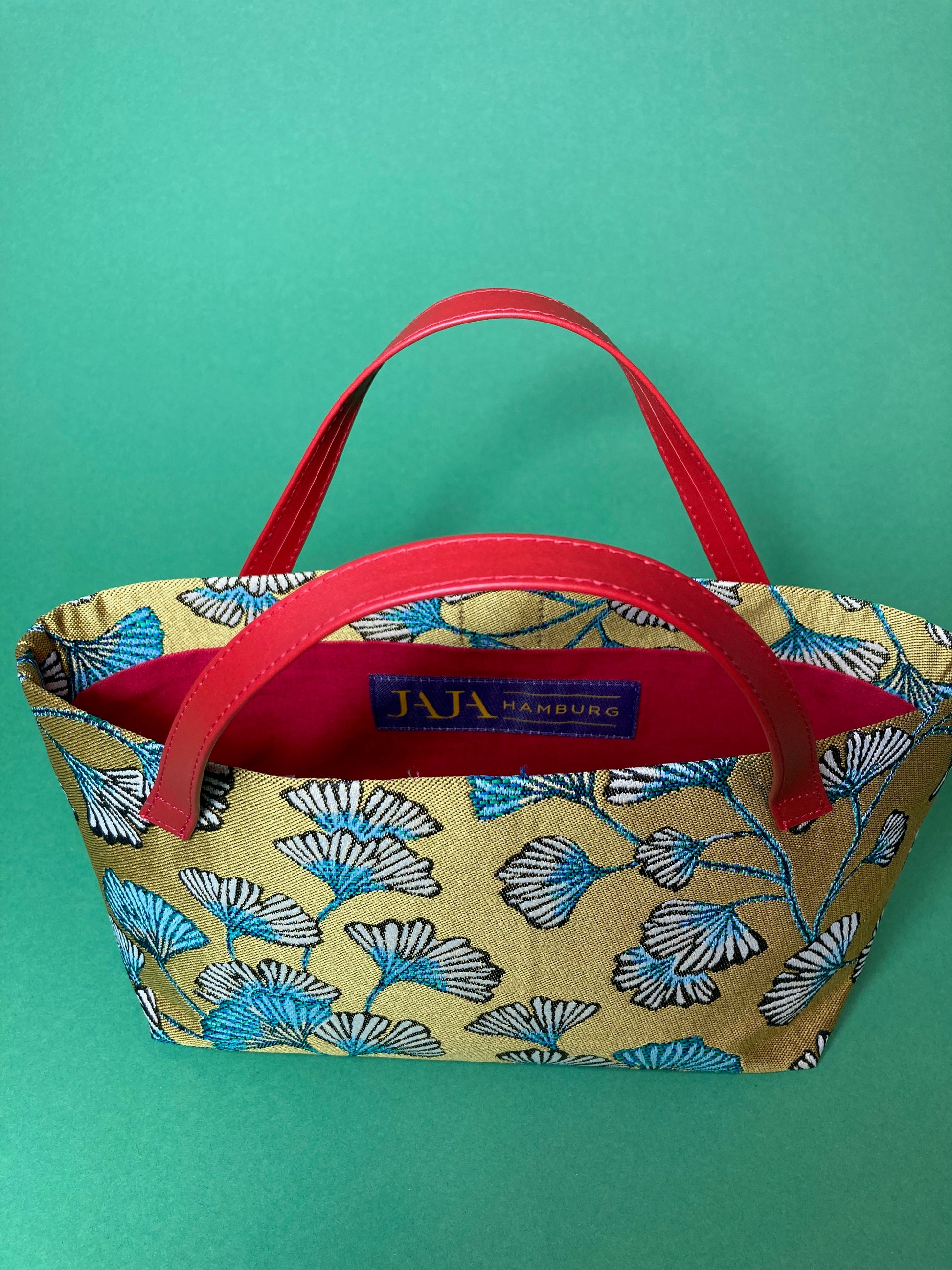 kleine Handtasche aus hochwertigem Dekostoff - weissgrüne Ginkoblätter auf goldenem Grund -mit rotem Baumwollfutter und roten Echtledergriffen