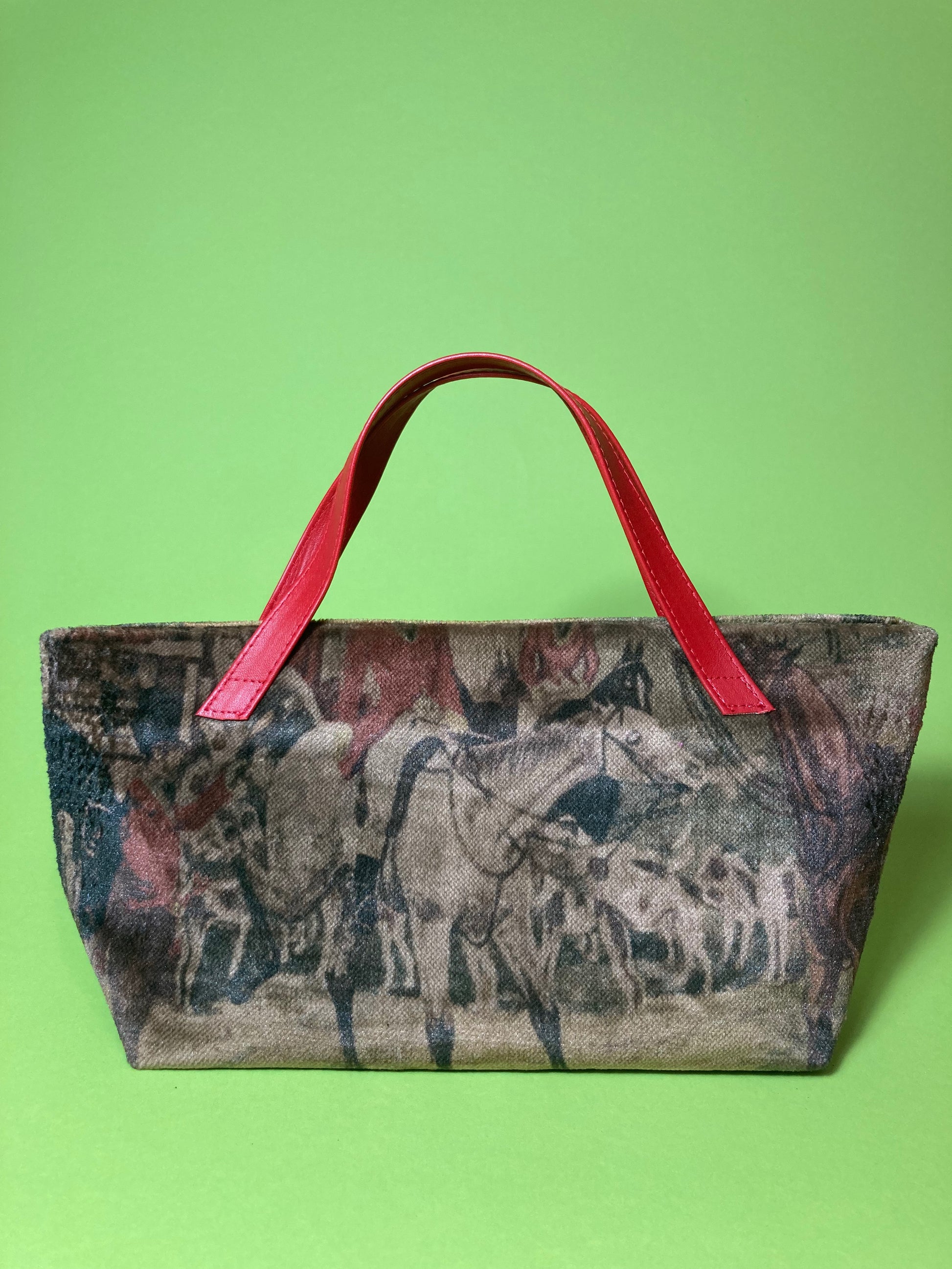 kleine Handtasche aus hochwertigem Samt-Dekostoff - Jagdreiterszene in milden graugrün Tönen-mit rotem Baumwollfutter und roten Echtledergriffen