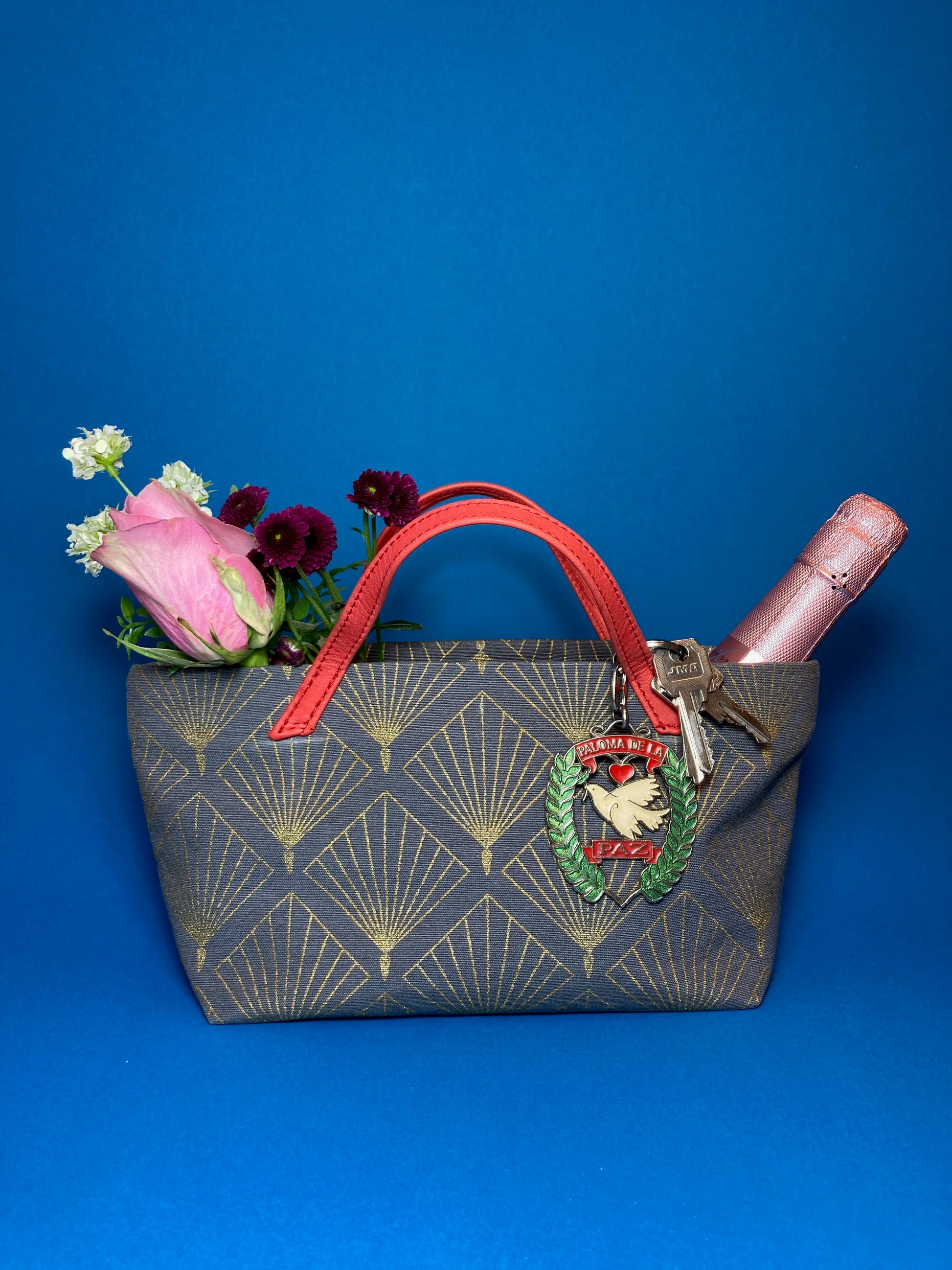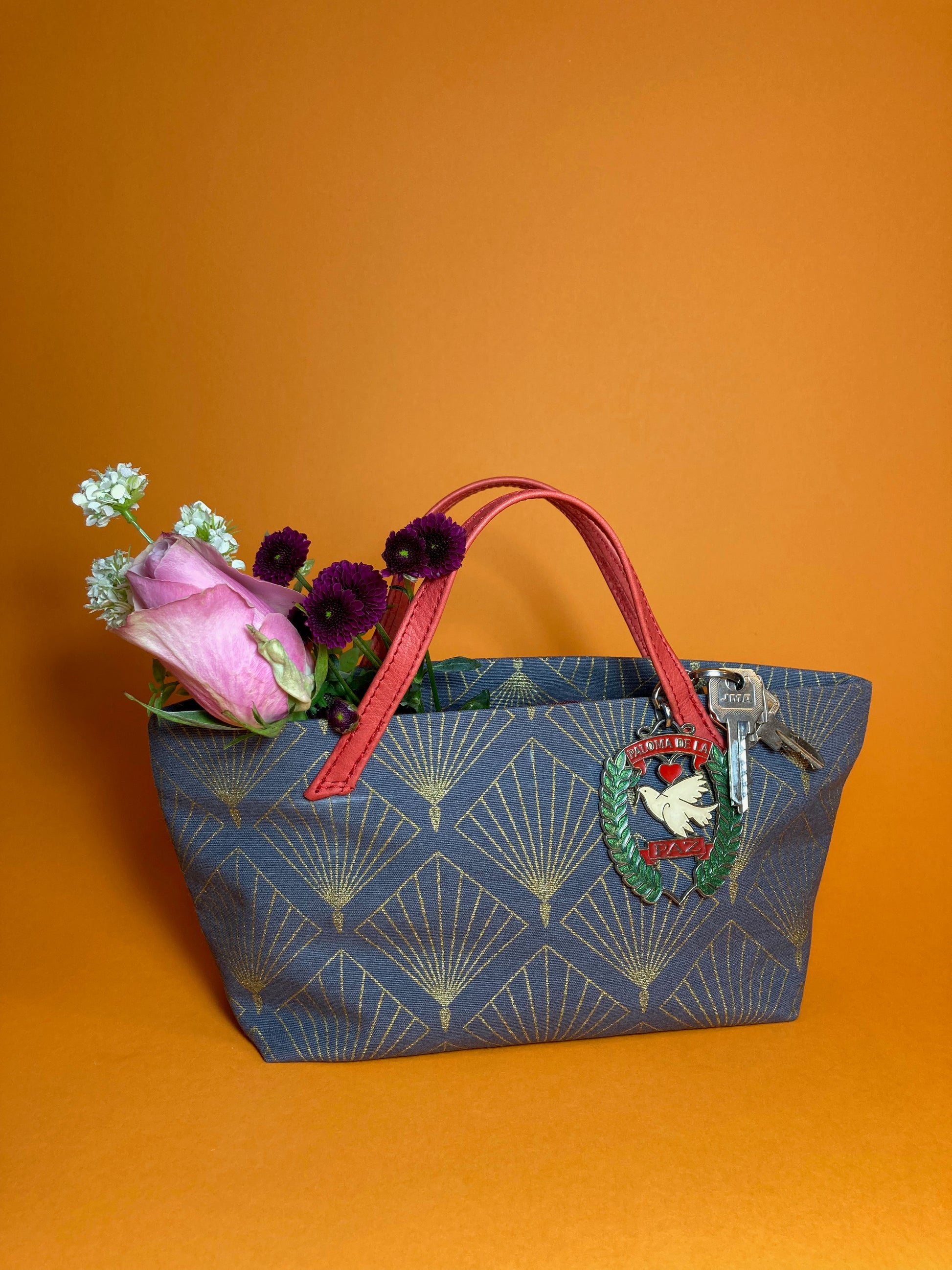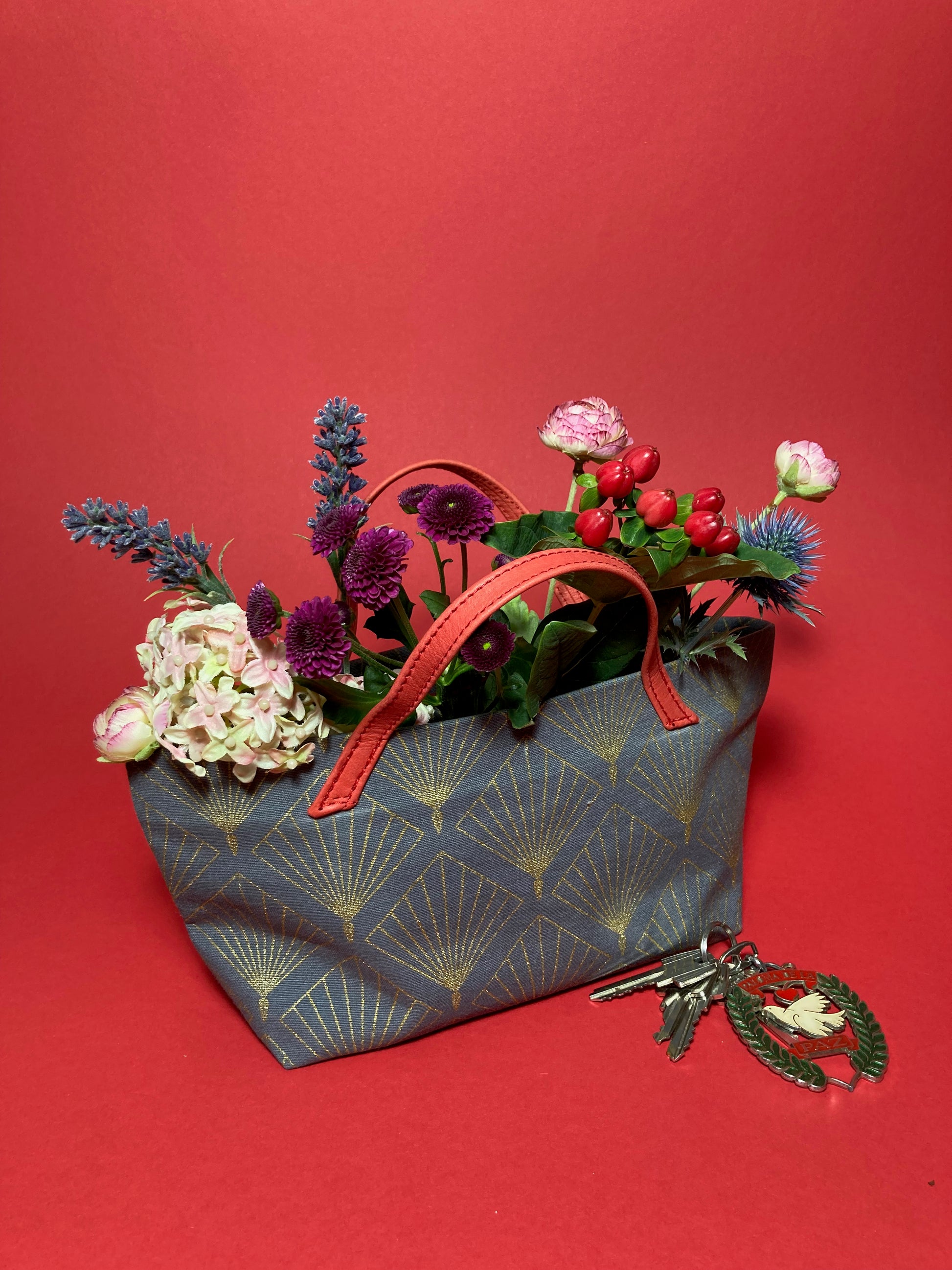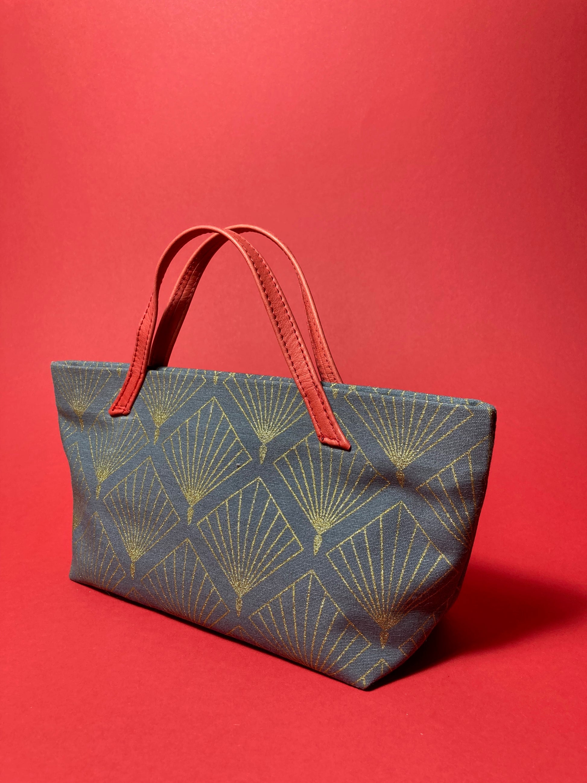 kleine Handtasche aus hochwertigem Dekostoff -gold gefächtertes Karomuster auf graublauem Grund-mit rotem Baumwollfutter und roten Echtledergriffen