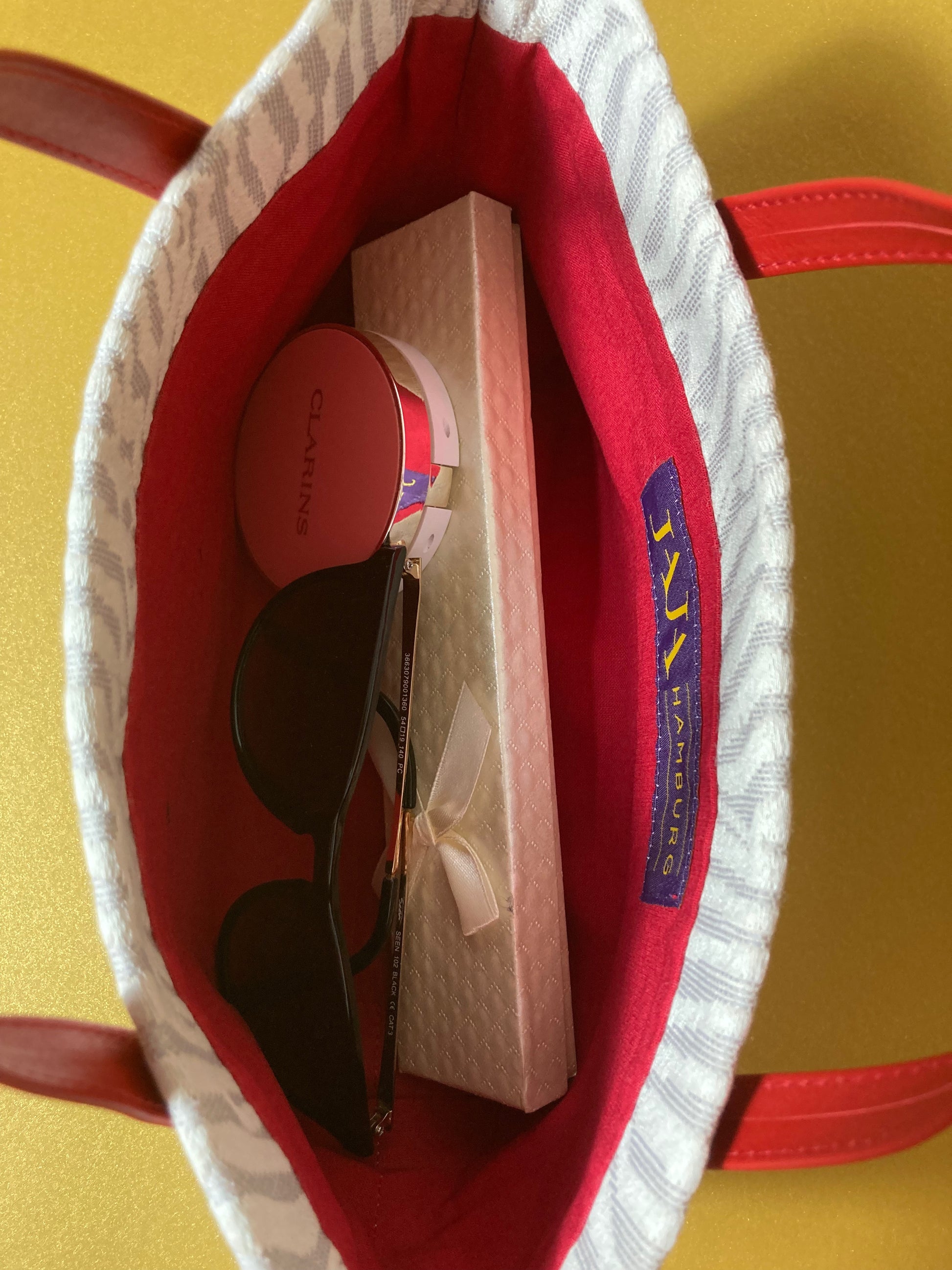 kleine Handtasche aus hochwertigem Dekostoff - uniweiss getigert -mit rotem Baumwollfutter und roten Echtledergriffen