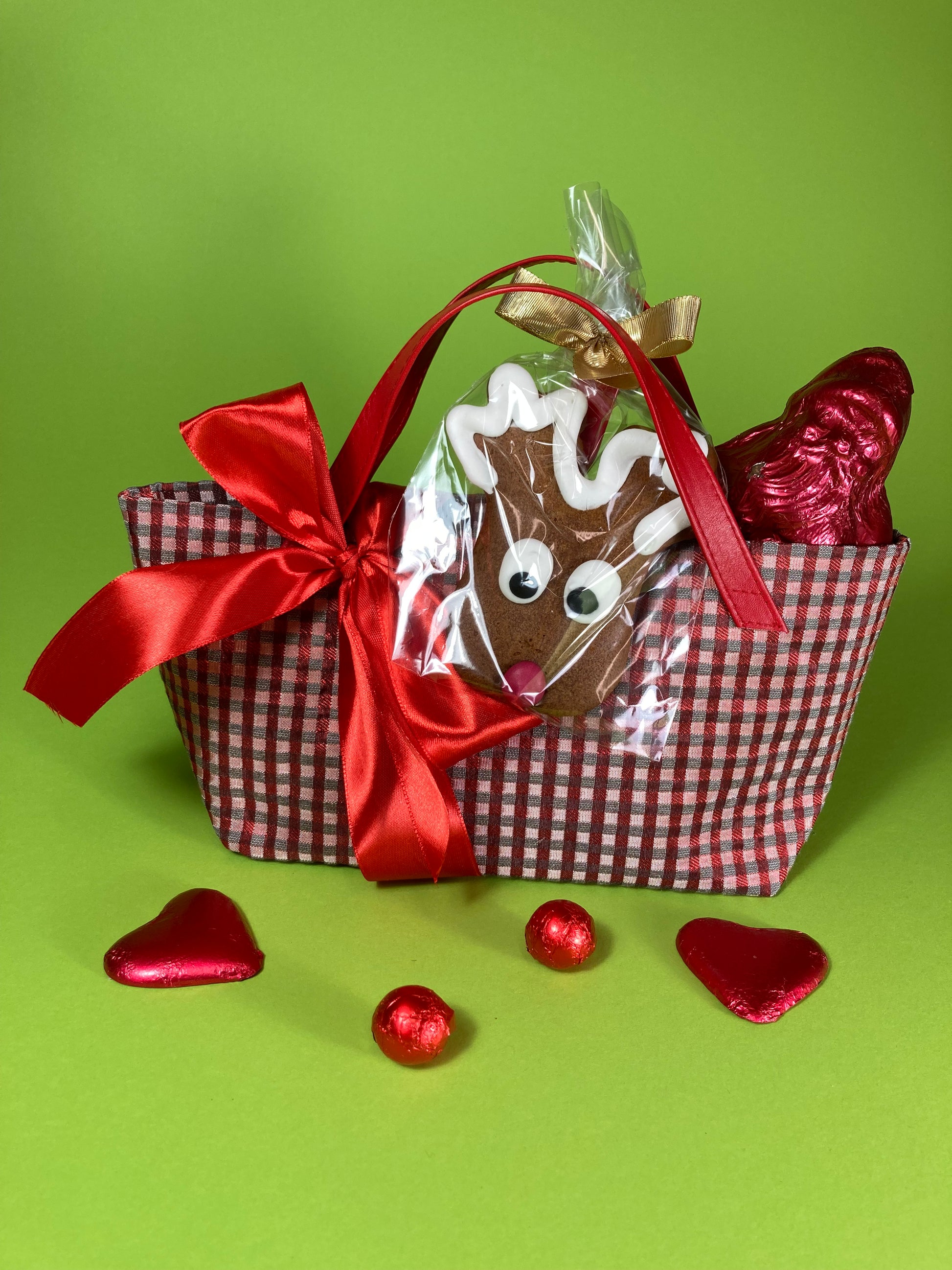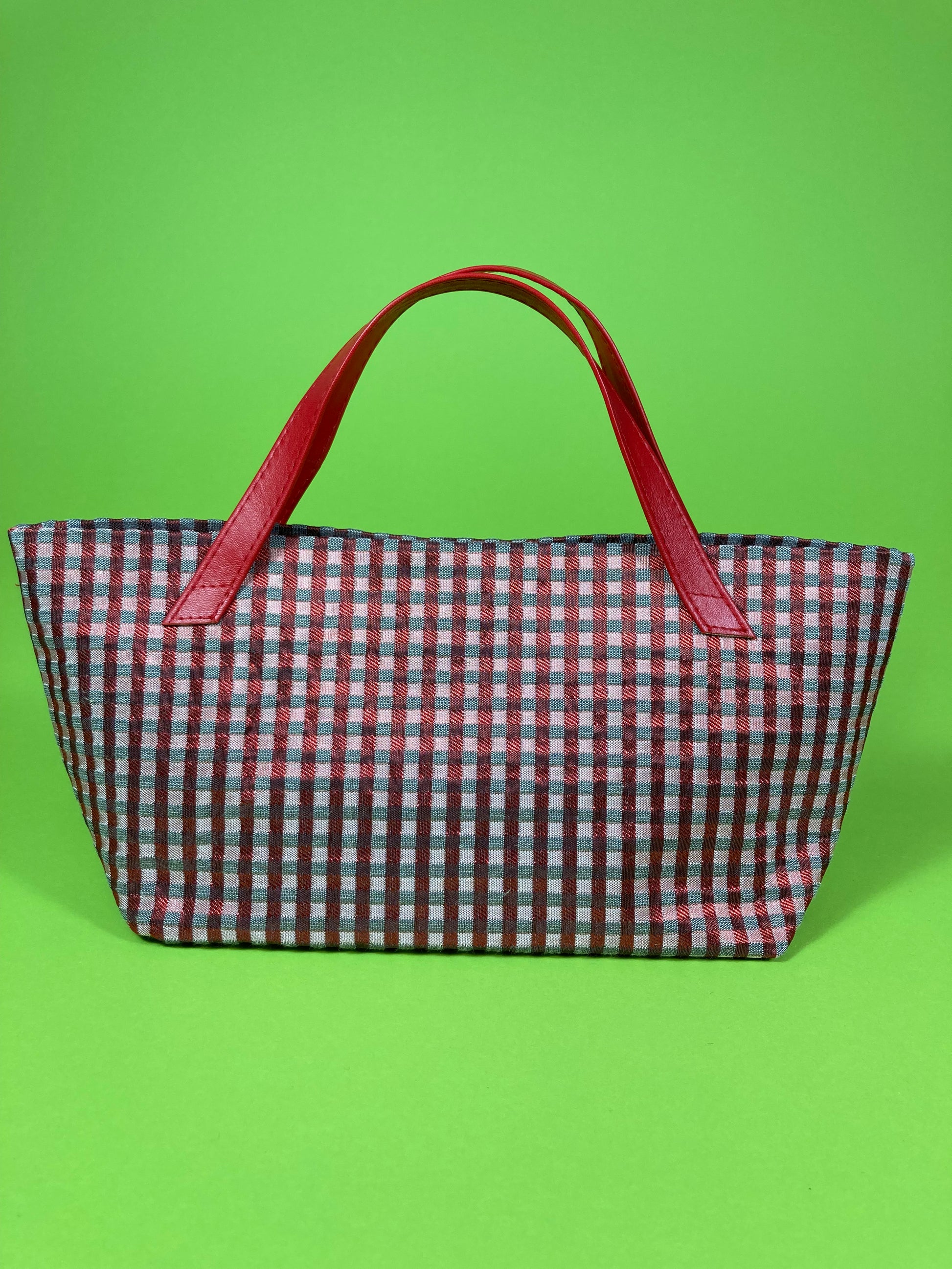 kleine Handtasche aus hochwertigem Dekostoff - leicht irrisierendes Material, rot-gaues Karomuster-mit rotem Baumwollfutter und roten Echtledergriffen