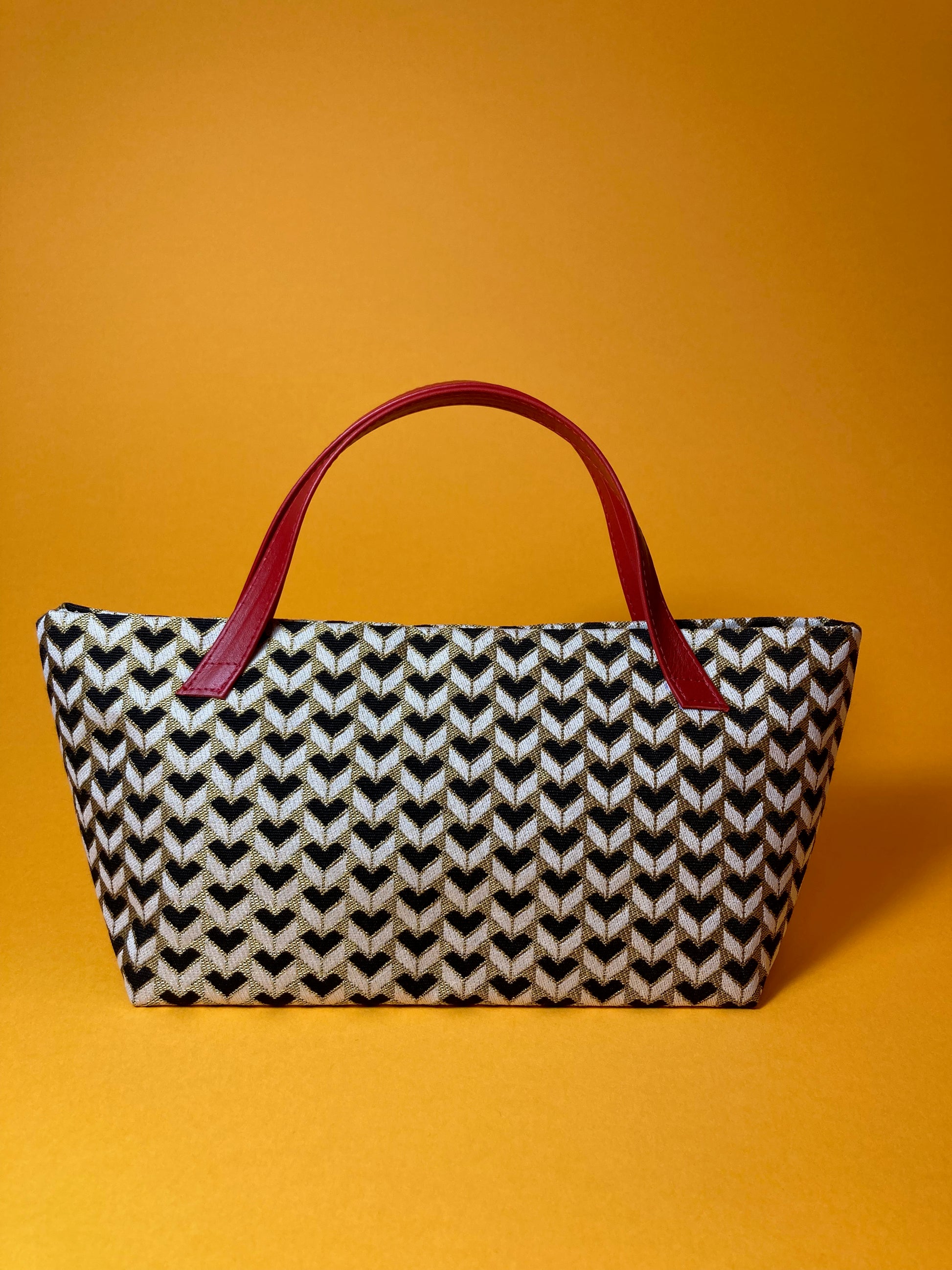 kleine Handtasche aus hochwertigem Dekostoff - grafisches Muster aus schwarzen Herzen und gold-weissen Elementen-mit rotem Baumwollfutter und roten Echtledergriffen