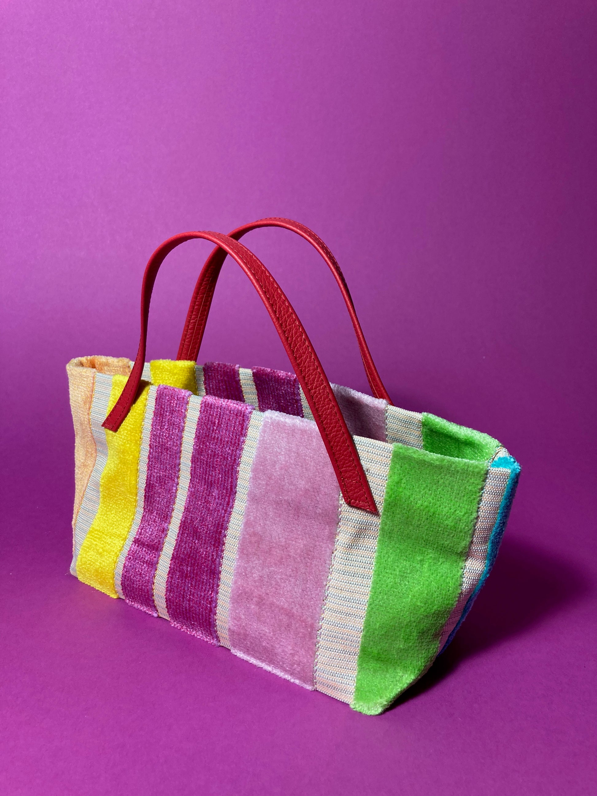 kleine Handtasche aus hochwertigem Samt-Dekostoff - dicke bunte waagerechte Blockstreifen-mit rotem Baumwollfutter und roten Echtledergriffen