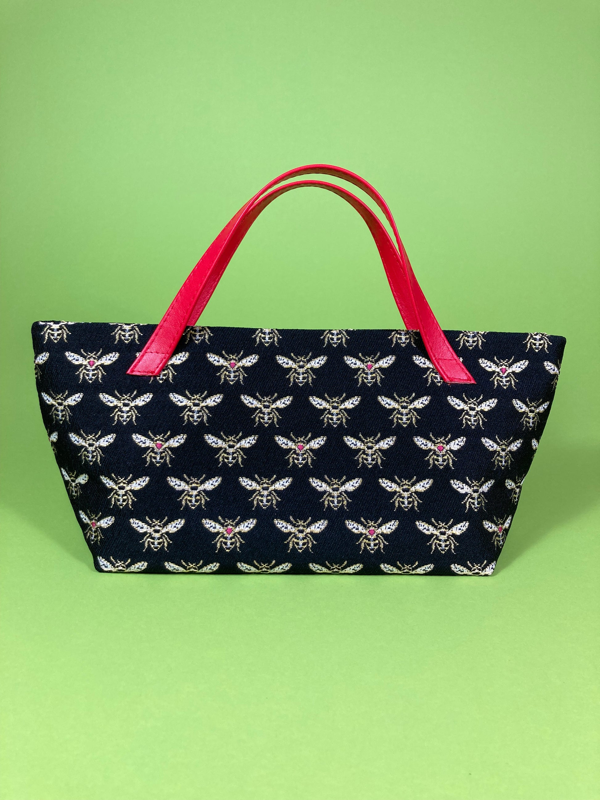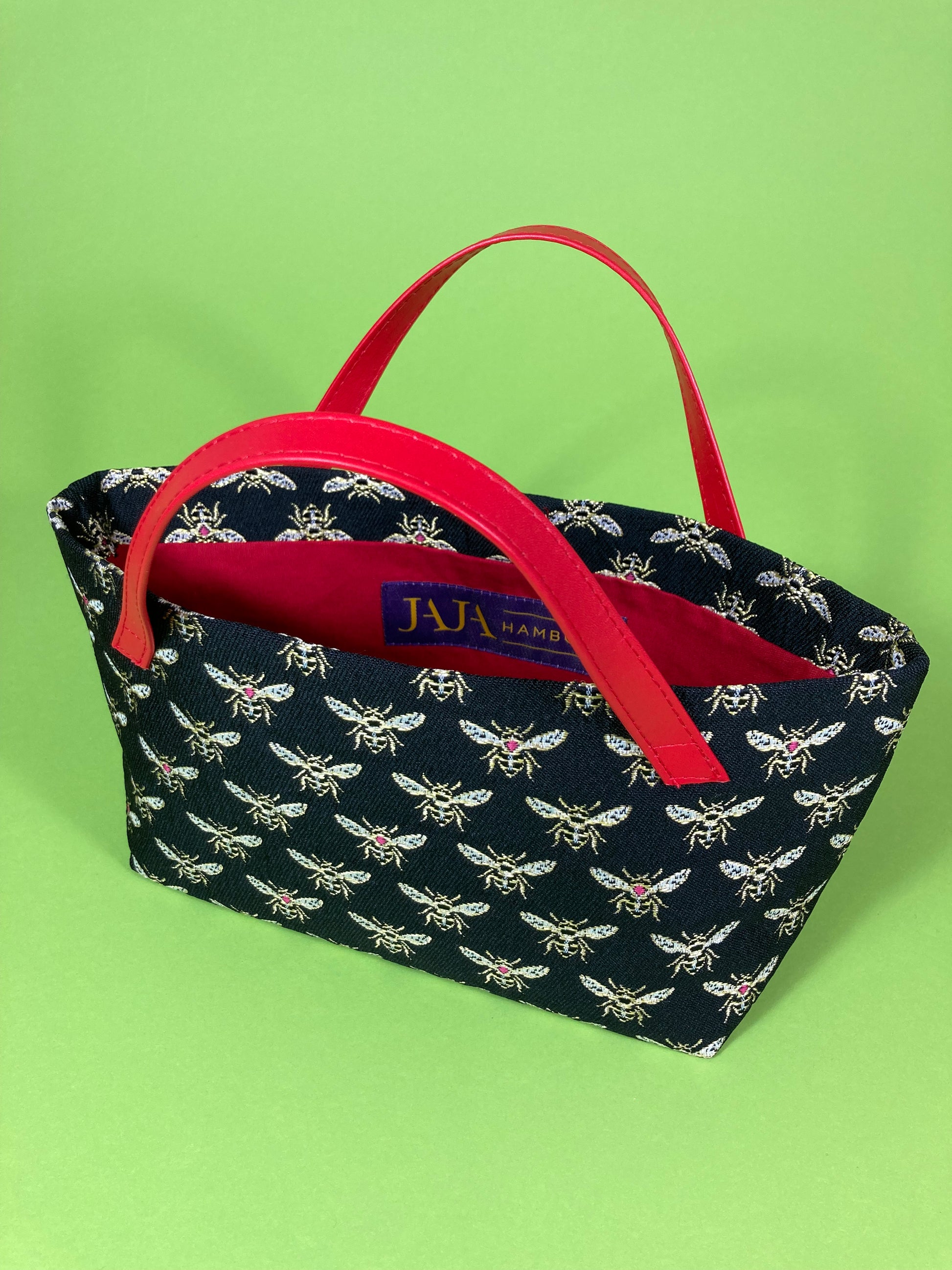 kleine Handtasche aus hochwertigem Dekostoff - Bienenmuster mit gold auf schwarzem Grund -mit rotem Baumwollfutter und roten Echtledergriffen